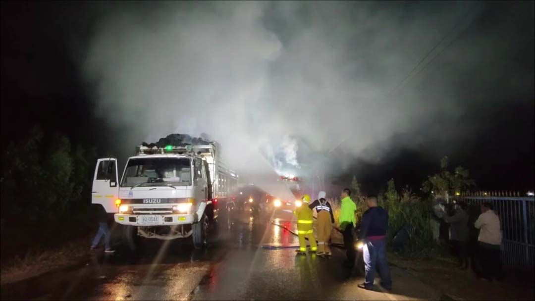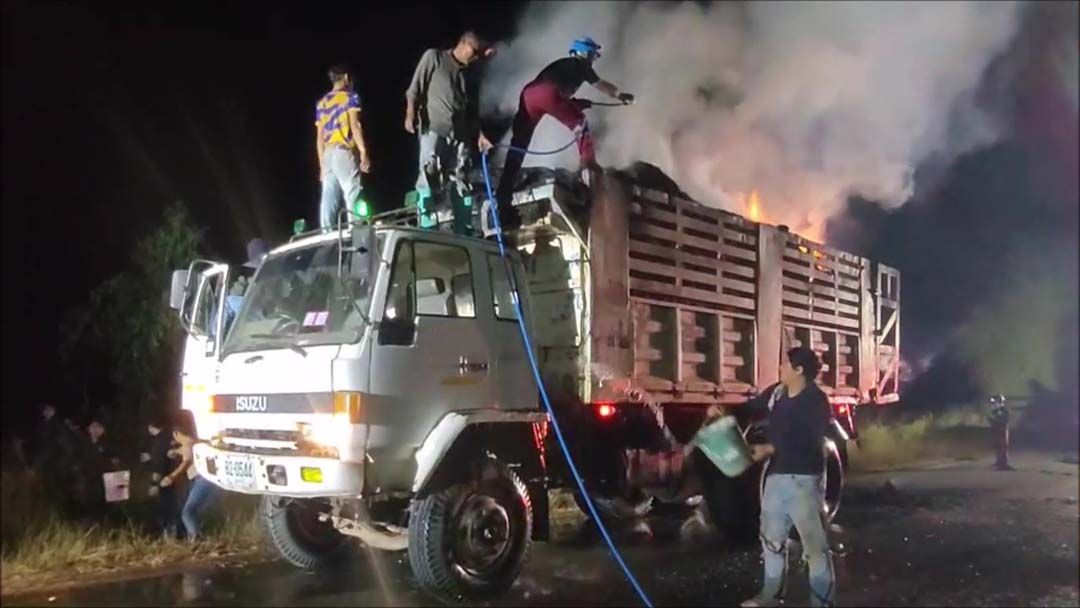 ขณะเดียวกันห่างไปประมาณ 1 กม.พบตัวแม่ของรถบรรทุก เป็นรถสิบล้อยี่ห้ออีซูซุ สีขาว ทะเบียน 82-0544 อุดรธานี บรรทุกฟางก้อนเช่นกัน ไฟกำลังลุกไหม้อย่างแรง ชาวบ้านที่นอนหลบในบ้าน เพราะความหนาวพากันตื่นตกใจต้องถือถังน้ำวิ่งไปตักน้ำข้างทางช่วยกันคนละไม้คนละมือ ช่วยกันดับไฟก่อนจะไหม้ตัวรถบบรรทุกตัวแม่ได้ทันท่วงที