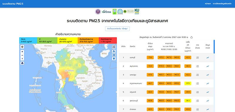 2 มกราคม 2567 กระทรวง อว. โดย GISTDA ร่วมกับสำนักงานการวิจัยแห่งชาติ, กรมควบคุมมลพิษ, มหาวิทยาลัยเกษตรศาสตร์ และมหาวิทยาลัยเชียงใหม่ เกาะติดสถานการณ์ฝุ่น PM 2.5 แบบรายชั่วโมง ด้วยข้อมูลจากดาวเทียมผ่านแอปพลิเคชั่น “เช็คฝุ่น” เมื่อเวลา 9.00 น. ของวันที่ 2 มกราคม 2567 พบว่า จังหวัดที่มีค่าเกินเกณฑ์มาตรฐานในระดับที่เริ่มมีผลกระทบต่อสุขภาพสีส้ม ???? ทั้งหมด 27 จังหวัด