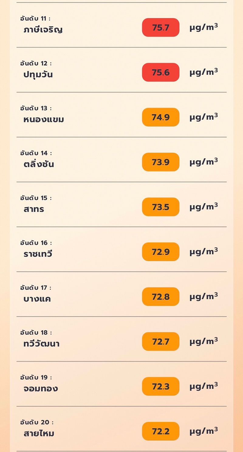 ในขณะที่กรุงเทพมหานคร พบค่าฝุ่น PM2.5 ที่มีผลกระทบต่อสุขภาพ ???? สีแดง จำนวน 12 เขต พบเขตที่สูงสุด 3 ลำดับ คือ #ดอนเมือง 82.2 ไมโครกรัม ตามด้วย #บางกอกใหญ่ 81.5 ไมโครกรัม และ #หลักสี่ 81.2 ไมโครกรัมตามลำดับ