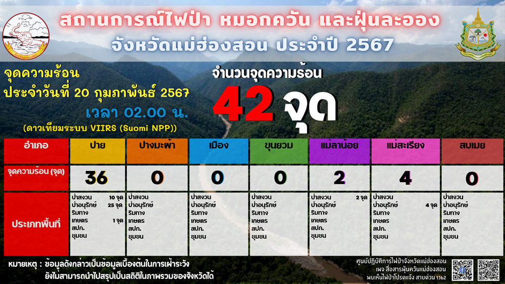 สำหรับสถานการณ์ไฟป่า หมอกควันและฝุ่นละออง ในพื้นที่ จ.แม่ฮ่องสอน ประจำวันที่ 20 กุมภาพันธ์ 2567 พบจุดความร้อน ช่วงเช้า จำนวน 42 จุด ในพื้นที่ อ.ปาย 36 จุด , อ.แม่ลาน้อย 2 จุด และ อ.แม่สะเรียง 4 จุด คุณภาพอากาศเกินมาตรฐานที่ ต.เวียงใต้ อ.ปาย วัดได้ 57.8 ไมโครกรัมต่อลูกบาศก์เมตร (ค่ามาตรฐานเกิน 37.5 ไมโครกรัมต่อลูกบาศก์เมตร คุณภาพอากาศโดยรวมอยู่ในระดับเริ่มมีผลกระทบต่อสุขภาพ) - 003