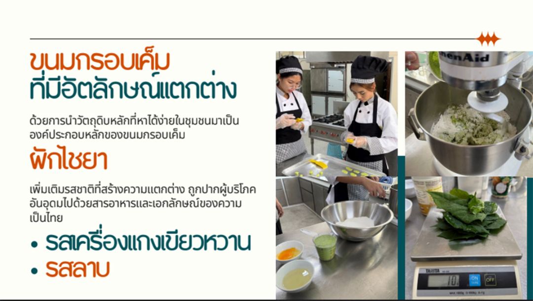 จึงนำทั้งสองอย่างมารวมกันพัฒนาสูตรทั้งหมด 3 สูตรเพื่อให้ถูกปากผู้บริโภคมากที่สุด และยังเป็นการนำแนวคิดช่วยลดขยะเหลือทิ้งจากอาหารหรือ Food Waste มาใช้ร่วมด้วย โดยระยะเวลาตั้งแต่เริ่มโครงการ จัดทำแผนและนำไปประกวด ใช้เวลา 3 เดือน ตั้งแต่ลงชุมชน และพัฒนาสูตรขนม ด้วยการนำผักไชยามาปั่น ผสมกับกะทิ แป้งสาลี นวดเป็นเวลา 30 นาที และนำมาหั่นเป็นชิ้นใส่แม่พิมพ์ จากนั้นนำไปทอดเป็นเวลา 5 นาที พักทิ้งไว้ แล้วนำไปใส่ในกระปุก
