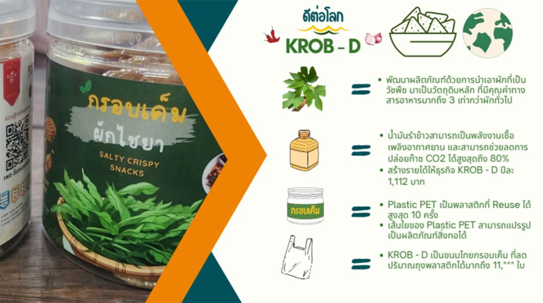 ทั้งนี้ ที่มาของการตั้งชื่อผลิตภัณฑ์ “กรอบ-ดี”มาจากตัวของขนมกรอบเค็มที่มีความกรอบ และมีผักไชยาที่ดีต่อสุขภาพ สื่อถึงได้เอกลักษณ์และอัตลักษณ์ของผลิตภัณฑ์ ส่วนแผนการตลาดของขนมนั้น ได้กำหนดกลุ่มเป้าหมายคือผู้ที่รักสุขภาพ หรือกลุ่มที่ไม่ชอบรับประทานผัก ส่วนบรรจุภัณฑ์ หรือ Pakaging ที่ใช้นั้น จะใช้พลาสติกที่มีความแข็งแรง เป็นมิตรต่อสิ่งแวดล้อม ถนอมอาหารได้ดีกว่า โดยช่วงแรกจะเริ่มวางขายที่ศูนย์โอท็อปจังหวัดนนทบุรี เครือข่ายภายในมหาวิทยาลัยราชภัฏทั่วประเทศก่อน และเมื่อมีกำลังการผลิตที่มากขึ้น ก็จะวางแผนขยายธุรกิจต่อไป