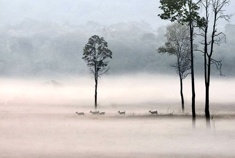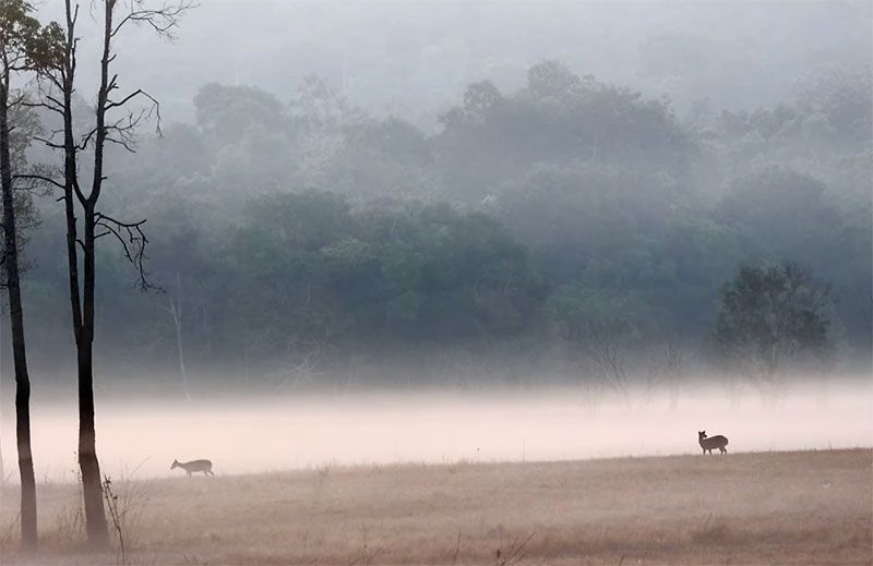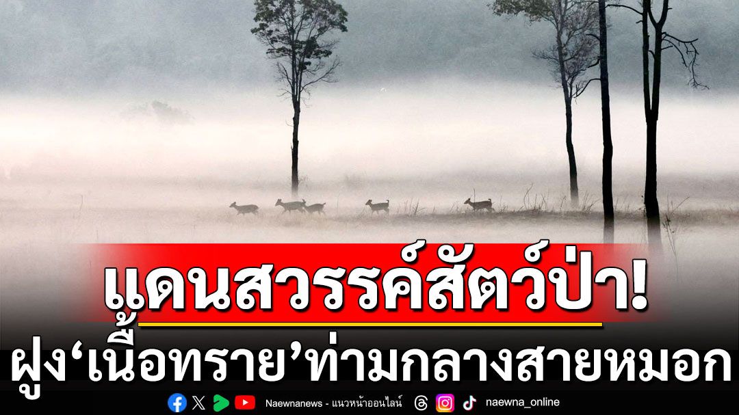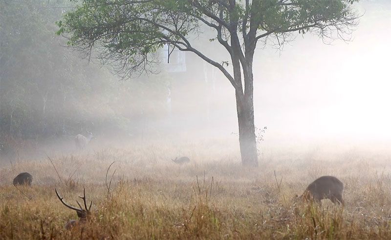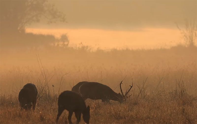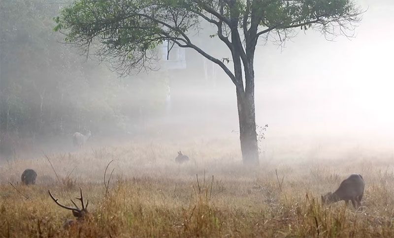 หญ้าที่เรี่ยต่ำเผยให้เห็นเนื้อทรายนอนพัก เดิน ยืนเล็มหญ้าเคล้าเสียงนกกาท่ามกลางสายหมอก