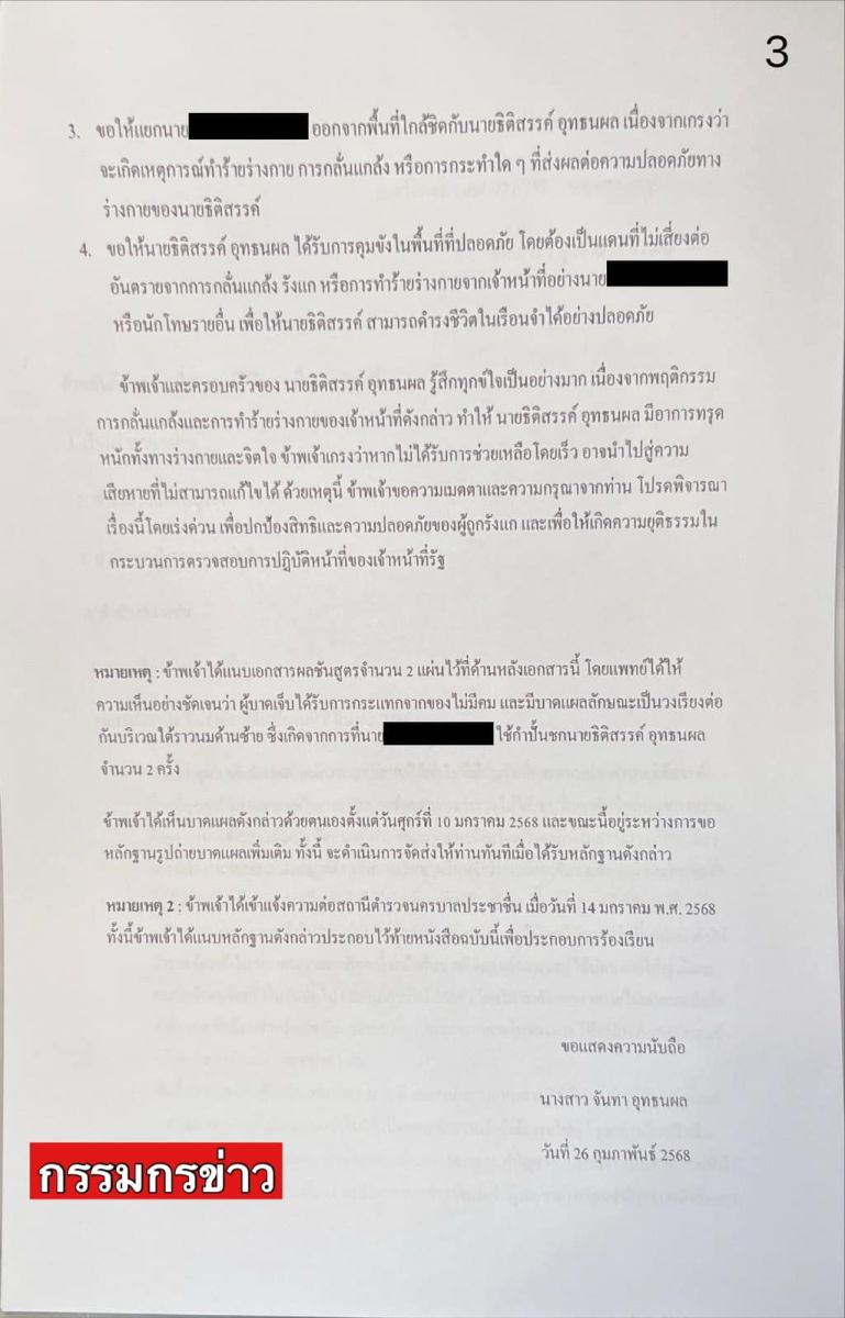 แม่ของอดีตผู้กำกับโจ้ ระบุเพิ่มเติมว่า ข้อมูลที่กล่าวมาในจดหมาย เป็นเพียงบางส่วนของเหตุการณ์ที่เกิดขึ้นเท่านั้น และยังทราบว่า นายสิทธิพร ยังมีพฤติกรรมกันแกล้งและกดดันนักโทษคนอื่นด้วย จึงขอร้องเรียนให้มีการตรวจสอบพฤติกรรมของนายสิทธิพรอย่างละเอียด และดำเนินการทางวินัยหากพบว่ามีการกระทำผิดจริง / ขอให้มีการนำตัวอดีตผู้กำกับโจ้ออกจากการคุมขังพิเศษที่แดน 5 โดยเร็ว / ขอให้แยกนายสิทธิพรออกจากพื้นที่ใกล้ชิดกับอดีตผู้กำกับโจ้เพราะกังวลว่าจะส่งผลต่อความปลอดภัย / และขอให้อดีตผู้กำกับโจ้ ได้รับการคุมขังในพื้นที่ปลอดภัย โดยต้องเป็นแดนที่ไม่เสี่ยงอันตรายจากการถูกกลั่นแกล้ง