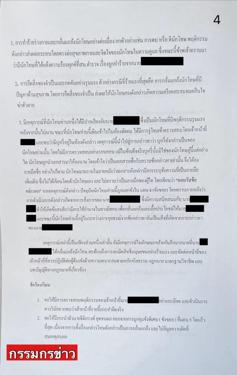 เนื้อความในจดหมายระบุว่า เป็นเรื่องการกลั่นแกล้งและการใช้ความรุนแรงโดยเจ้าหน้าที่ควบคุม ขอร้องเรียนให้ตรวจสอบพฤติกรรมที่ไม่เหมาะสมของเจ้าหน้าที่ควบคุมที่ชื่อว่า นายสิทธิพร แก้วคำบ้ง ซึ่งมีการกระทำส่งผลกระทบต่อสวัสดิภาพ ความปลอดภัย และสิทธิขั้นพื้นฐานของนักโทษอย่างร้ายแรง