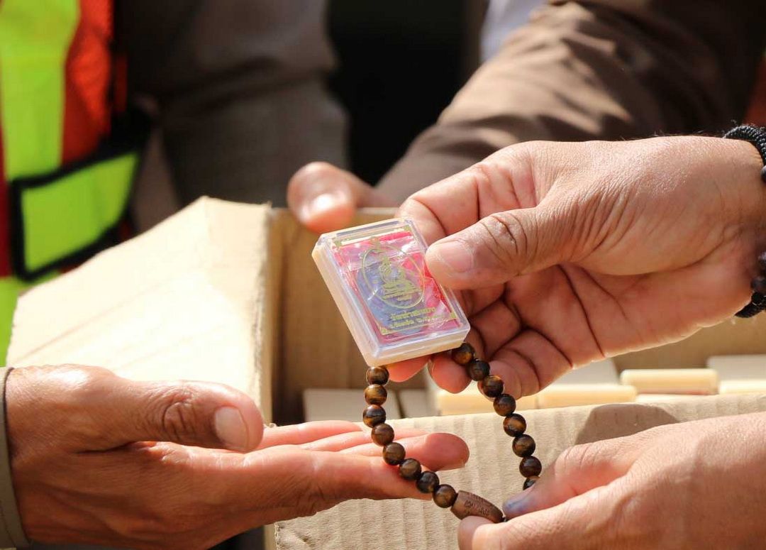อย่างไรก็ตาม กิจกรรมรณรงค์ถนนปลอดภัยครั้งนี้ นอกจากเจ้าหน้าที่ตำรวจจะมอบหมวกนิรภัยให้กับผู้ขับขี่รถจักรยานยนต์แล้ว พ.ต.อ.วีระ หางนาค ผกก.สภ.เมืองกาฬสินธุ์ ยังได้มอบวัตถุมงคลเหรียญไหว้ครูปี 2568 และกำไรตะกรุดสำริด ของพระราชวัชราวิทยาคม หรือพระอาจารต้อม ปภสฺสโร วัดท่าสะแบง จ.ร้อยเอ็ด เพื่อเป็นที่ยึดเหนี่ยวจิตใจและเป็นการสร้างขวัญกำลังใจในการปฏิบัติหน้าที่ให้กับเจ้าหน้าที่ตำรวจจราจร สภ.เมืองกาฬสินธุ์อีกด้วย ///-026
