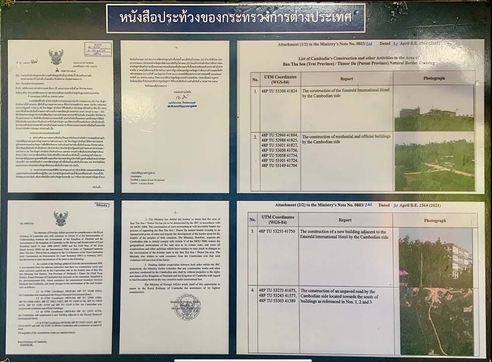 + พ.ค.2565 กรมสนธิสัญญาและกฎหมาย กต. มีหนังสือประท้วงกัมพูชาละเมิด MOU 43 กรณีมีการก่อสร้างสิ่งปลูกสร้างล้ำแนวสันปันน้ำบริเวณที่จะยกระดับช่องทางธรรมชาติบ้านท่าเส้นเป็นจุดผ่านแดนถาวร มีประเด็o