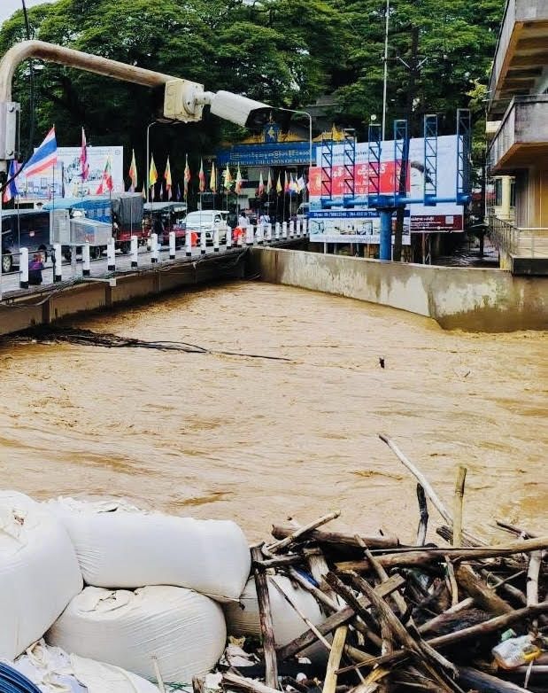 วันที่ 1 ต.ค.68 ผู้สื่อข่าวรายงานว่า ฝนที่ตกลงมาทั่วภาคหนือและรัฐฉานตะวันออกเนื่องจากอิทธิพลของพายุบัวลอย ได้ทำให้ระดับน้ำในแม่น้ำสายชายแดนไทย-เมียนมา เพิ่มระดับสูงขึ้น โดยตั้งแต่ช่วงเช้าระดับน้ำที่สะพานมิตรภาพไทย-เมียนมา ข้ามแม่น้ำสายแห่งที่ 1 อ.แม่สาย จ.เชียงราย ได้ล้นตลิ่งอยู่ที่ร้อยละ 110.03 อย่างไรก็ตามน้ำไม่เข้าท่วมชุมชมในฝั่งไทยทั้งที่ ต.เวียงพางคำ ต.แม่สาย และ ต.แม่สายมิตรภาพ อ.แม่สาย จ.เชียงราย เนื่องจากมีแนวป้องกันน้ำท่วมชั่วคราวและกึ่งถาวรที่สร้างโดยกรมการทหารช่าง กองทัพบก สูงที่ริมฝั่งกว่า 3 เมตร ทำให้น้ำไม่พ้นระดับพนังดังกล่าว โดยมีเพียงน้ำซึมเข้ามาเล็กน้อยบริเวณที่อยู่ติดแนวพนัง เช่น ตลาดสายลมจอย ชุมชนไม้ลุงขน ชุมชนเกาะทราย ฯลฯ