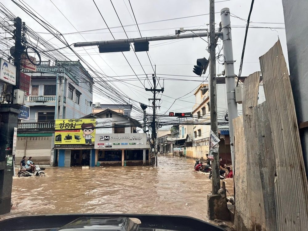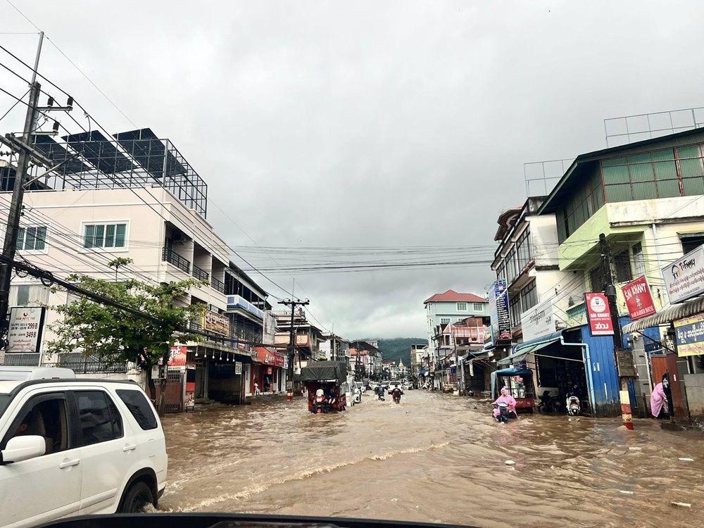 อย่างไรก็ตาม พบว่าน้ำได้ทะลักเข้าท่วม จ.ท่าขี้เหล็ก ประเทศเมียนมา ที่อยู่ฝั่งตรงกันข้ามแม่น้ำสายอย่างหนัก โดยเฉพาะถนนหลายสายในตัวเมืองท่าขี้เหล็ก ตลาดท่าล้อ ห้างร้าน บ้านเรือน ฯลฯ ถูกน้ำท่วมขังเป็นบริเวณกว้าง รถเล็กไม่สามารถสัญจรผ่านไปมาได้ในบางเส้นทาง ชาวบ้านในฝั่งเมียนมาต้องขนย้ายข้าวของหนีน้ำกันอย่างฉุกระหุกเนื่องจากน้ำทะลักเข้าท่วมอย่างรวดเร็ว ทั้งนี้ สาเหตุส่วนหนึ่งที่ทำให้น้ำเข้าท่วมฝั่งท่าขี้เหล็กคือการขุดลอกโดยฝ่ายเป็นมาเป็นไปด้วยความล่าช้า หลังจากฝ่ายไทยตกลงกับฝ่ายเมียนมาว่าฝ่ายไทยจะขุดลอกแม่น้ำรวดระยะทาง 32 กิโลเมตร ส่วนแม่น้ำสายระยะทาง 12.8 กิโลเมตร ให้ฝ่ายเมียนมาทำหน้าที่ขุดลอก