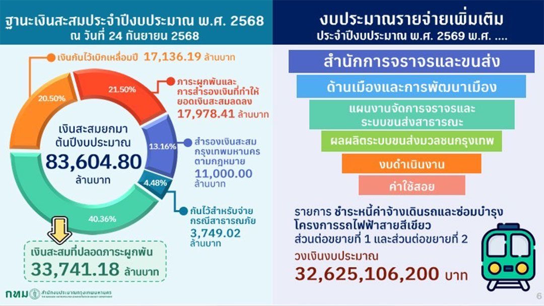ทั้งนี้ นายชัชชาติ ยังได้รายงานถึงสถานะการเงินการคลังของกทม. ณ วันที่ 24 กันยายน 2568 เงินฝากธนาคาร 86,575.25 ล้านบาท และมีภาระหนี้ผูกพันจำนวน 192 โครงการ เป็นเงินจำนวน 75,698.52 ล้านบาท ขณะที่ฐานะเงินสะสมประจำปีงบประมาณ พ.ศ.2568 ปลอดภาระผูกพัน 33,741.18 ล้านบาท