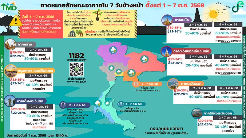 คาดหมายอากาศรายภาค วันที่ 2 ตุลาคม – 8 ตุลาคม พ.ศ. 2568
