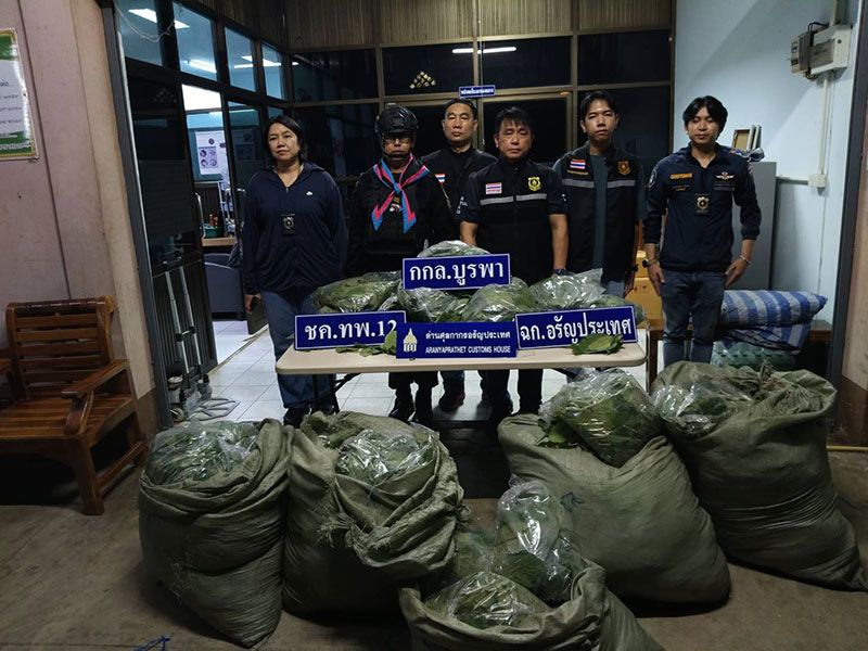 3 ตุลาคม 2568 เมื่อวันที่ 2 ตุลาคม พ.อ.ชัยณรงค์ กาสี ผบ.ฉก.อรัญประเทศ กกล.บูรพา (ผู้บังคับหน่วยเฉพาะกิจอรัญประเทศ กองกำลังบูรพา )และ พ.อ.เมธี คำเต็ม ผบ.ชค.ทพ.12 (ผู้บังคับการชุดควบคุมกรมทหารพรานที่12) นำกำลังหน่วยเฉพาะกิจอรัญประเทศและชุดควบคุมกรมทหารพรานที่ 12 (ร้อย.ทพ.1204) เข้าทำการตรวจยึดใบกระท่อมสดจำนวนมาก บรรจุในกระสอบพลาสติค ซุกซ่อนอยู่ในไร่อ้อยริมชายแดนบ้านหนองปรือ อ.อรัญประเทศ จ.สระแก้ว หลังเจ้าหน้าที่ออกทำการลาดตะเวณตามแนวชายแดน ได้ตรวจพบกลุ่มบุคคลต้องสงสัย กำลังแบกกระสอบเดินลัดเลาะอยู่ในไร่อ้อย