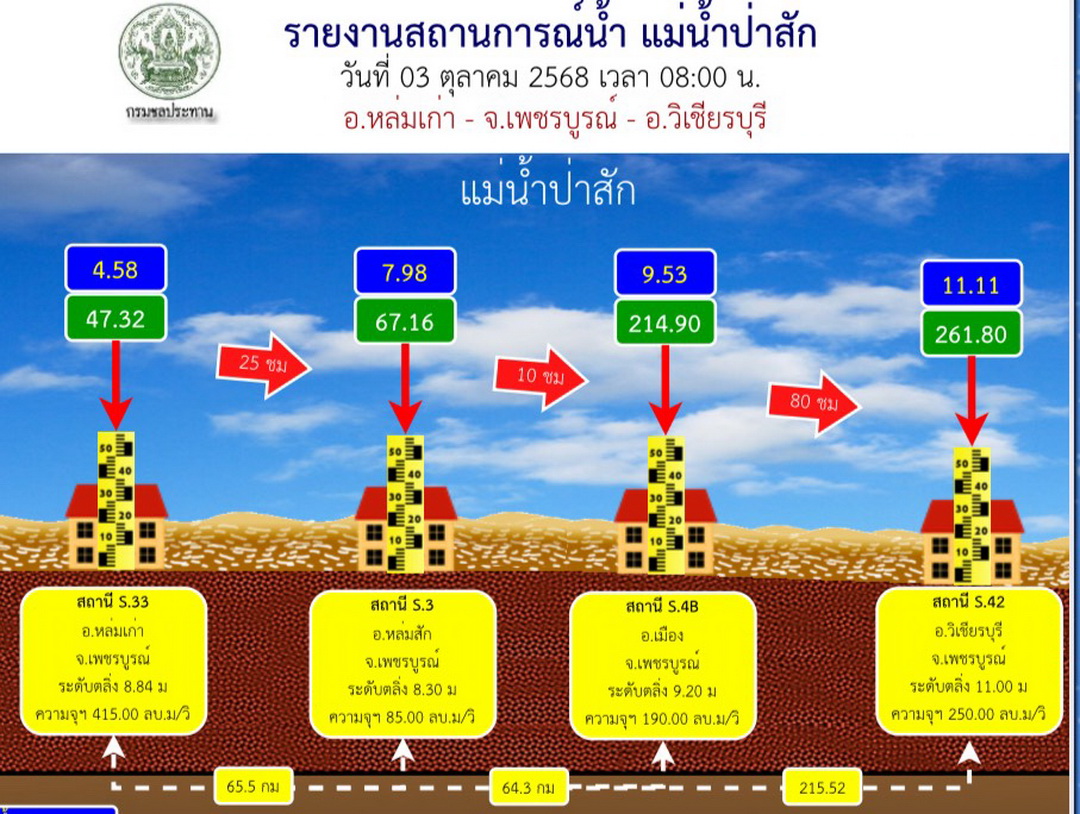 วันที่ 3 ตุลาคม 2568 กองอำนวยการป้องกันและบรรเทาสาธารณภัยจังหวัดเพชรบูรณ์ ได้รายงานสถานการณ์ระดับน้ำในแม่น้ำป่าสัก โดยมีข้อมูลที่น่าเฝ้าระวังในพื้นที่ อ.เมืองเพชรบูรณ์ ซึ่งสถานีตำบลตาดกลอย (S33) ระดับน้ำ 4.58 เมตร (ต่ำกว่าตลิ่ง 4.26 ม.) แนวโน้มลดลง , สถานีตำบลตาลเดี่ยว (S3 - อ.หล่มสัก) ระดับน้ำ 7.98 เมตร (ระดับตลิ่ง 8.30 ม.) ลดลง 3 ซม. ต่อเนื่อง , สถานีอำเภอเมืองเพชรบูรณ์ (S4B): ระดับน้ำ 9.53 เมตร สูงกว่าตลิ่ง 33 ซม. และมี แนวโน้มเพิ่มขึ้น และสถานีอำเภอวิเชียรบุรี (S42) ระดับน้ำ 11.11 เมตร (สูงกว่าตลิ่ง 11 ซม.) แต่มีแนวโน้มลดลง