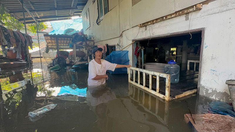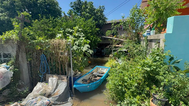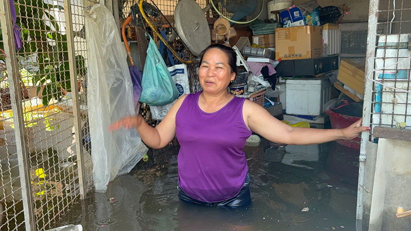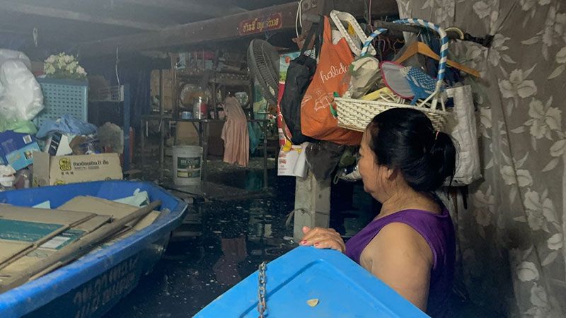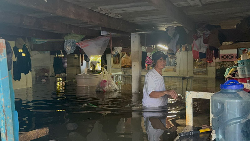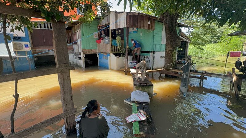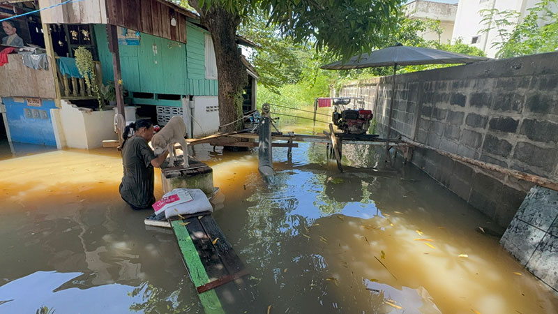 ส่วนทางด้านนางยุพิน ปลื้มจิตร อายุ 59 ปี บ้านเลขที่ 69/1 ถนนเทศบาล 8 เล่าให้ฟังว่า ได้เก็บข้าวข้องเตรียมไว้แล้ว เมื่อคืนที่ผ่านมาน้ำไหลซึมเข้าท่วมบ้านสูงกว่า 1 เมตร ได้เก็บข้าวของขึ้นไว้ชั้น 2 ของบ้านแล้ว เข้าออกทางหน้าต่างปีนลงหลังคาเข้ารั้วบ้านญาติเป็นทางเข้าออกชั่วคราว