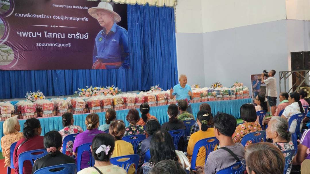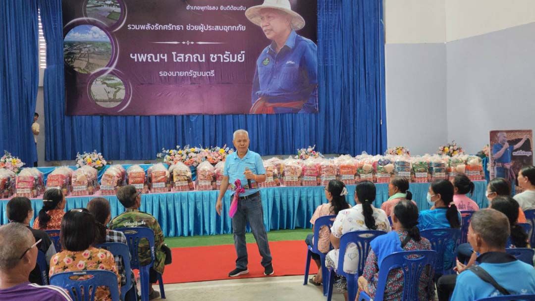 เมื่อวันที่ 5 ตุลาคม 2568 นายโสภณ ซารัมย์ รองนายกรัฐมนตรี ลงพื้นที่ จ.บุรีรัมย์ เพื่อติดตามสถานการณ์อุทกภัย และพบปะให้กำลังใจประชาชนผู้ประสบภัย พร้อมมอบถุงยังชีพช่วยเหลือผู้ประสบอุทกภัย ในพื้นที่ 3 อำเภอ รวมจำนวน 830 ครัวเรือน ได้แก่ อ.คูเมือง 250 ครัวเรือน , อ.พุทไธสง 400 ครัวเรือน และ อ.บ้านใหม่ไชยพจน์ 180 ครัวเรือน โดยมี นายศักดิ์ ซารัมย์ สส.บุรีรัมย์ พรรคภูมิใจไทย (ภท.) พร้อมด้วย นายมนูญศักดิ์ นามประเทือง นายอำเภอคูเมือง , นายเสกสรร จันวงษา นายอำเภอพุทไธสง , นายนิสิต วงศ์หทัย นายอำเภอบ้านใหม่ไชยพจน์ , หัวหน้าส่วนราชการ , ผู้บริหารองค์กรปกครองส่วนท้องถิ่น และประชาชนในพื้นที่ ร่วมพิธีมอบ