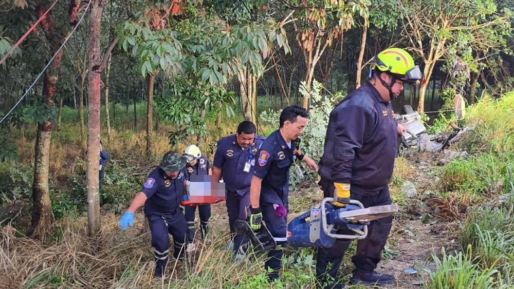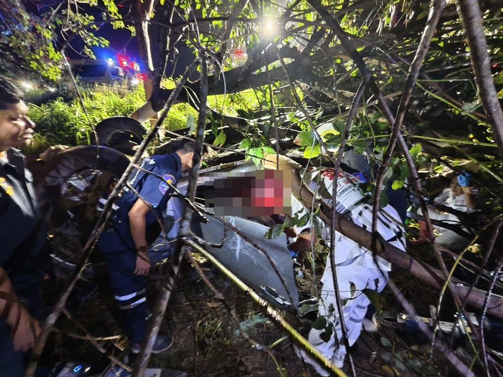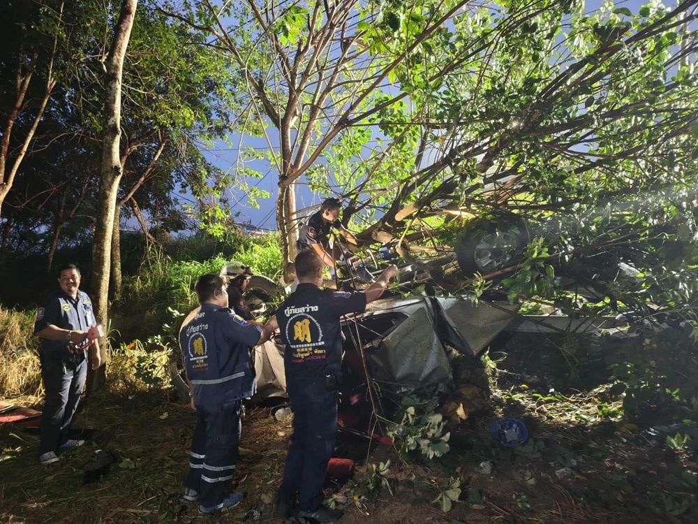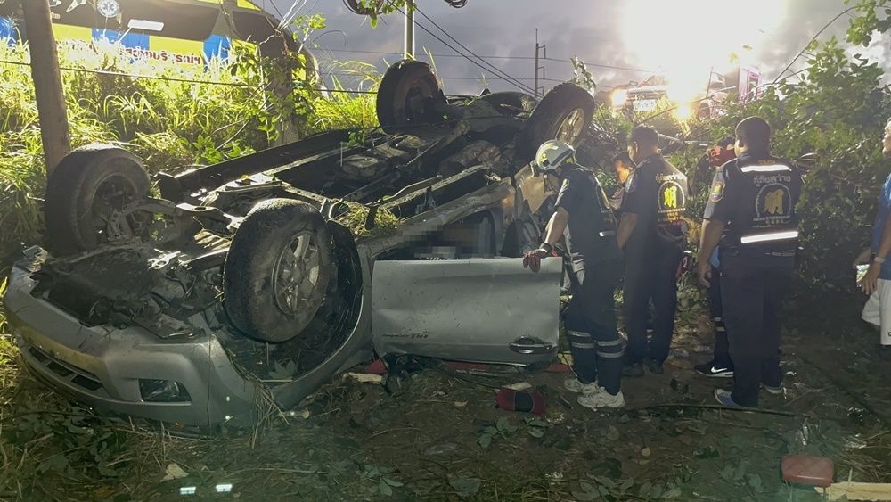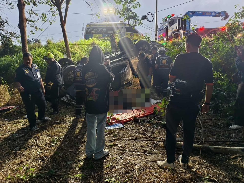 ฝนตกถนนลื่นหนุ่มควบกระบะเสียหลักชนเสาไฟ-ต้นยางพลิกคว่ำดับ 1 สาหัส 2