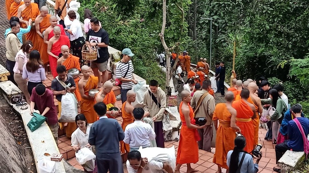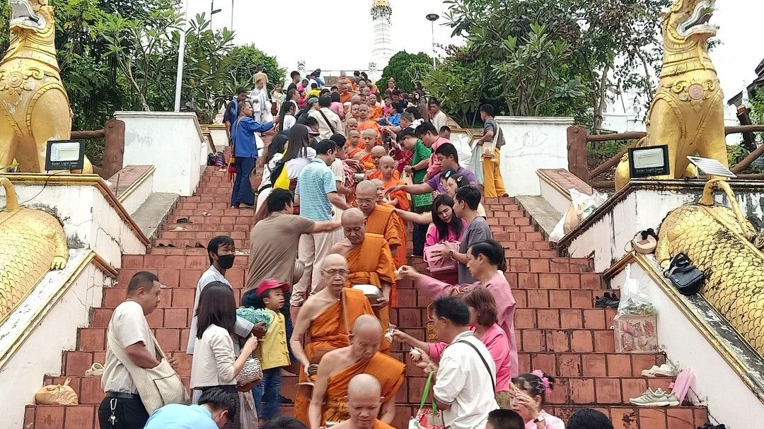 ภาพของผู้คนนับร้อยคนที่ยืนเรียงแถวตามขั้นบันไดที่คดเคี้ยว ท่ามกลางสายหมอกยามเช้าและอากาศที่เย็นสบาย ถือเป็นภาพที่สวยงามและหาชมได้ยาก ซึ่งสอดคล้องกับความเชื่อที่ว่าพระสัมมาสัมพุทธเจ้าเสด็จลงมาโปรดยังโลกมนุษย์ในช่วงวันออกพรรษา