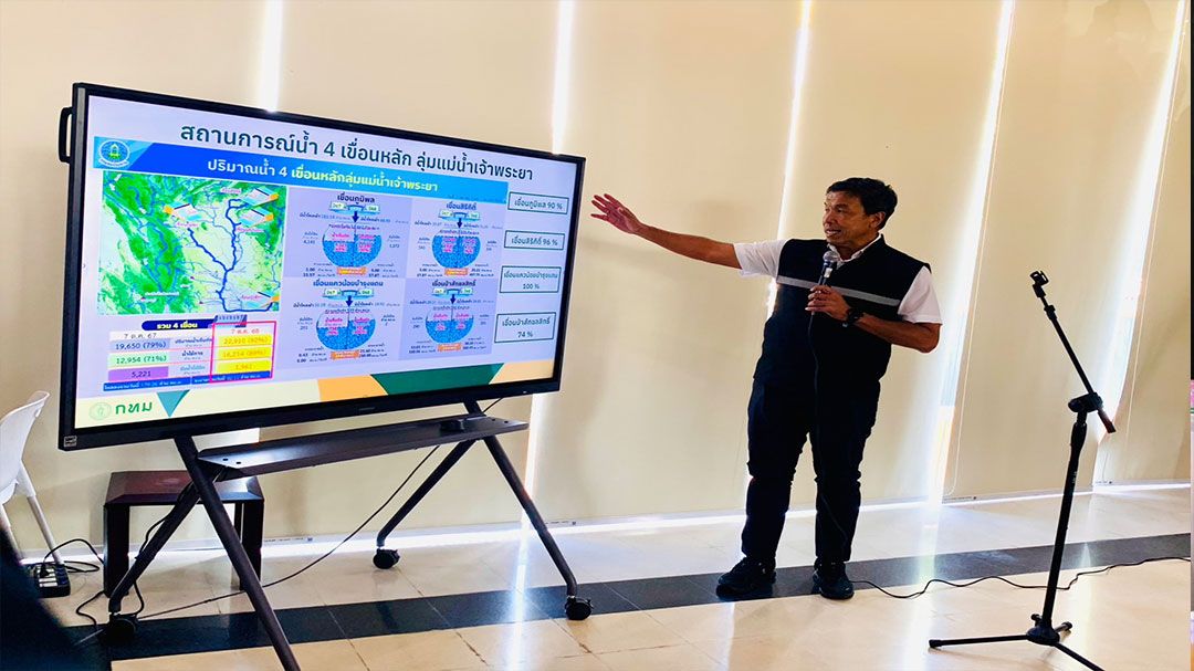 นายฐนโรจน์ สรุปสถานการณ์น้ำเหนือ ว่า สถานการณ์ลุ่มน้ำเจ้าพระยา โดยเฉพาะอ่างเก็บน้ำขนาดใหญ่ที่มีผลกระทบต่อการบริหารจัดการน้ำ ได้แก่ เขื่อนสิริกิติ์ ปัจจุบันมีความจุอยู่ที่ 96% คาดว่าจะมีความจุอยู่ที่ 100% พอดี เขื่อนแควน้อย ปัจจุบันน้ำล้นแล้วมีน้ำที่ลงมาเติมกับลำน้ำน่าน ปริมาณน้ำที่ไหลเข้าเขื่อนน้อยกว่าปริมาณน้ำที่ระบายลง ซึ่งระดับน้ำในเขื่อนจะกลับเข้าสู่สภาวะปกติใช้เวลาไม่เกิน 1 สัปดาห์ เขื่อนภูมิพลปัจจุบันมีความจุอยู่ที่ 89% คาดว่าจะไม่ล้น เขื่อนป่าสักชลสิทธิ์คาดว่าน้ำจะล้น จึงมีการสลับเพิ่มการระบายน้ำในช่วงที่น้ำเหนือกำลังลงมาเพิ่มการระบายน้ำสูงสุด 6,000 ลบ.ม./วินาที