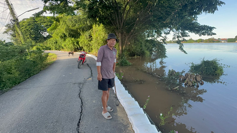 ด้าน นายยม อายุ 53 ปี ชาวบ้านหมู่ 2 ตำบล ตลาดกรวด อำเภอเมือง เล่าให้ฟังว่า เมื่อเช้าที่ผ่านมาพบว่าน้ำเริ่มลดลงเห็นได้ชัดซึ่งเมื่อวานนั้นน้ำเจ้าพระยาเอ่อขึ้นมาที่ริมถนน ทางเจ้าหน้าที่ อบต.ตลาดกรวด ได้มาวางกระสอบทรายป้องกันน้ำขนานกับถนนริมแม่น้ำเจ้าพระยา แต่ตอนเช้าพบว่าน้ำได้ลดลงจากขอบถนนเห็นได้ชัดเจน แต่อย่างไรก็ตามเราเจอสถานการณ์น้ำหลากมาเป็นประจำ ทุกครั้งเราก็อยู่กับน้ำก็รับได้ตลอด ไม่ได้ตื่นเต้นและหวาดกลัวแต่อย่างไร เคยชินแล้ว และที่สำคัญเรามีผู้นำที่เข็มแข็งดูแลช่าวยเหลือชาวบ้านอย่างดี