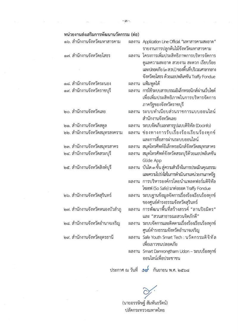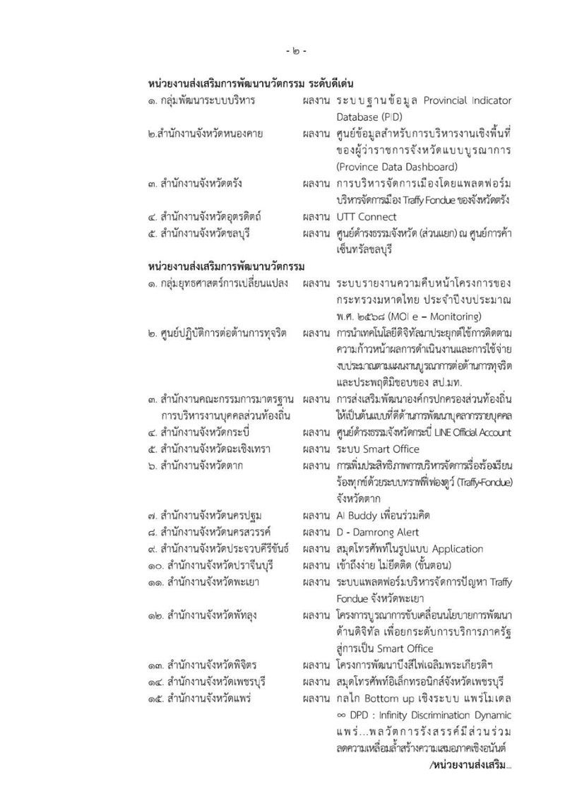 นอกจากนี้ ยังมีผลงานจากสำนักงานจังหวัดต่าง ๆ อีกกว่า 36 หน่วยงานที่ได้รับรางวัลหน่วยงานส่งเสริมการพัฒนานวัตกรรม ระดับดีเด่น และหน่วยงานส่งเสริมนวัตกรรมการสะท้อนถึงพลังความคิดสร้างสรรค์และความมุ่งมั่นในการพัฒนาระบบราชการให้ก้าวทันโลกดิจิทัล