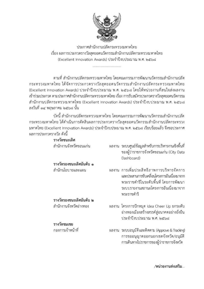 กระทรวงมหาดไทย ประกาศผลรางวัล "Excellent Innovation Award 2025" สุดยอดนวัตกรรม สป.มท. "สำนักงานจังหวัดขอนแก่น" คว้ารางวัลชนะเลิศ ผลงานระบบศูนย์ข้อมูลสำหรับการบริหารงานเชิงพื้นที่