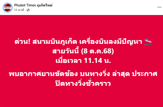 8 ต.ค. 68 ท่าอากาศยานภูเก็ต (ทภก.) ชี้แจงเหตุอากาศยานขัดข้องบนทางวิ่งเมื่อเวลา 11.14 น. ทภก. พบอากาศยานขัดข้องบนทางวิ่ง