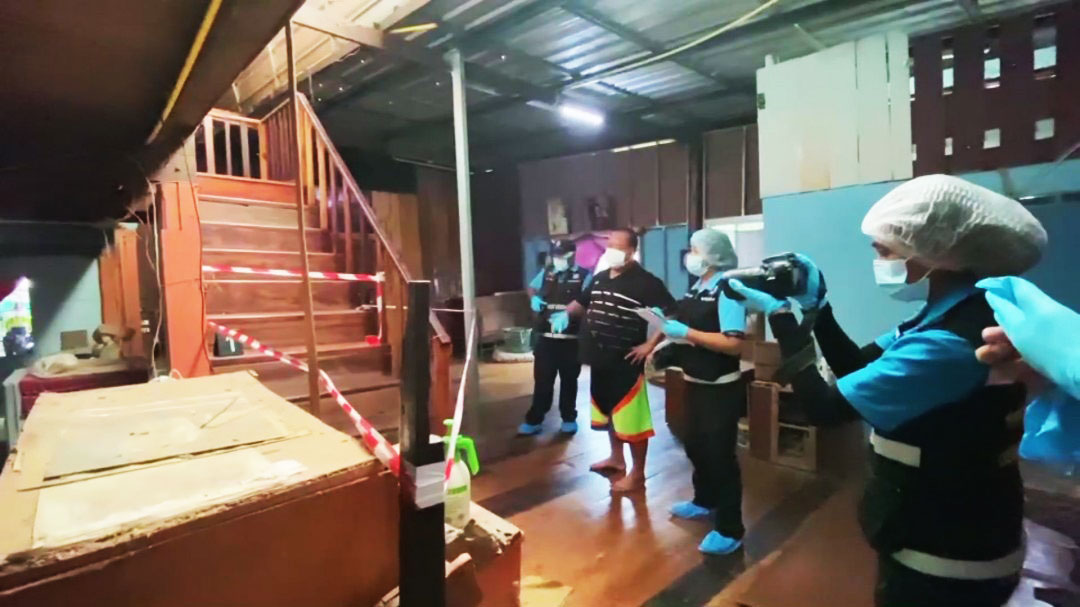 ที่เกิดเหตุเป็นบ้านสองชั้น ครึ่งปูนครึ่งไม้ บริเวณชั้นล่างพบคราบเลือดจำนวนมาก เปื้อนพื้นและผนังบ้าน อีกทั้งยังมีรอยเลือดเป็นทางลากขึ้นไปบนชั้นสอง และรอยนิ้วมือเปื้อนเลือดบริเวณเสาใกล้บันไดขึ้นบ้าน