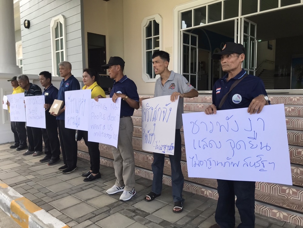 วันที่ 8 ตุลาคม 2568 ผู้สื่อข่าวรายงานว่าที่บริเวณหน้าศาลากลางจังหวัดพังงา ภายในศูนย์ราชการจังหวัดพังงา มีมวลชนจำนวนหนึ่งนำโดยนายดุสิต บู่ทอง ผู้แทนจากสมาคมประชาสังคมพังงาแห่งความสุข นายศิริพงศ์ ก้อนทรัพย์ รองนายกองค์การบริหารส่วนตำบลป่ากอ ร่วมกันเดินถือป้ายข้อความที่เขียนด้วยลายมือเป็นข้อความทั้งภาษาไทยและภาษาอังกฤษ แสดงจุดยืนว่าชาวพังงาคัดค้านการที่ประเทศสหรัฐอเมริกาขอใช้พื้นที่ฐานทัพเรือพังงา ตั้งฐานทัพหรือทำกิจกรรมทางการทหาร โดยมีนายบัญชา ธนูอินทร์ รองผู้ว่าราชการจังหวัดพังงา พร้อมด้วยเจ้าหน้าที่ศูนย์ดำรงธรรมจังหวัดพังงา เป็นผู้รับมอบหนังสือ