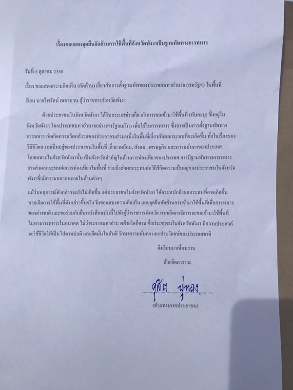 แม้ว่าเหตุการณ์ดังกล่าวจะยังไม่เกิดขึ้น แต่ประชาชนในจังหวัดพังงา ได้ตระหนักถึงผลกระทบที่อาจเกิดขึ้นหากเกิดการใช้พื้นที่ดังกล่าวขึ้นจริง จึงขอแสดงความคิดเห็น และจุดยืนคัดด้านการเข้ามาใช้พื้นที่เพื่อการทหารของต่างชาติ และขอร่วมกันขึ้นหนังสือฉบับนี้ไปยังผู้ว่าราชการจังหวัด หากเกิดกรณีการจะขอเข้ามาใช้พื้นที่ในทางการทหารในอนาคต ไม่ว่าจะจากมหาอำนาจฝ่ายใดก็ตาม ซึ่งประชาชนในจังหวัดพังงา มีความประสงค์จะใช้ชีวิตให้เป็นไปตามปกติ และยึดมั่นในสันติ รักษาความมั่นคง และประโยชน์ของประเทศชาติ