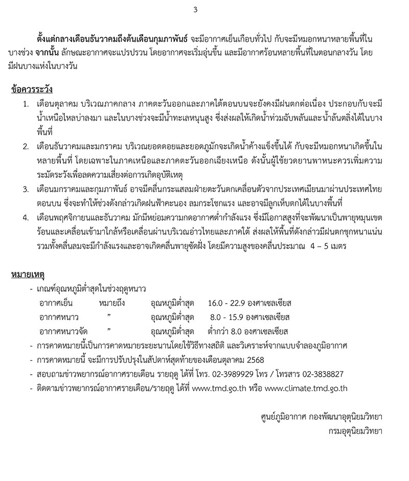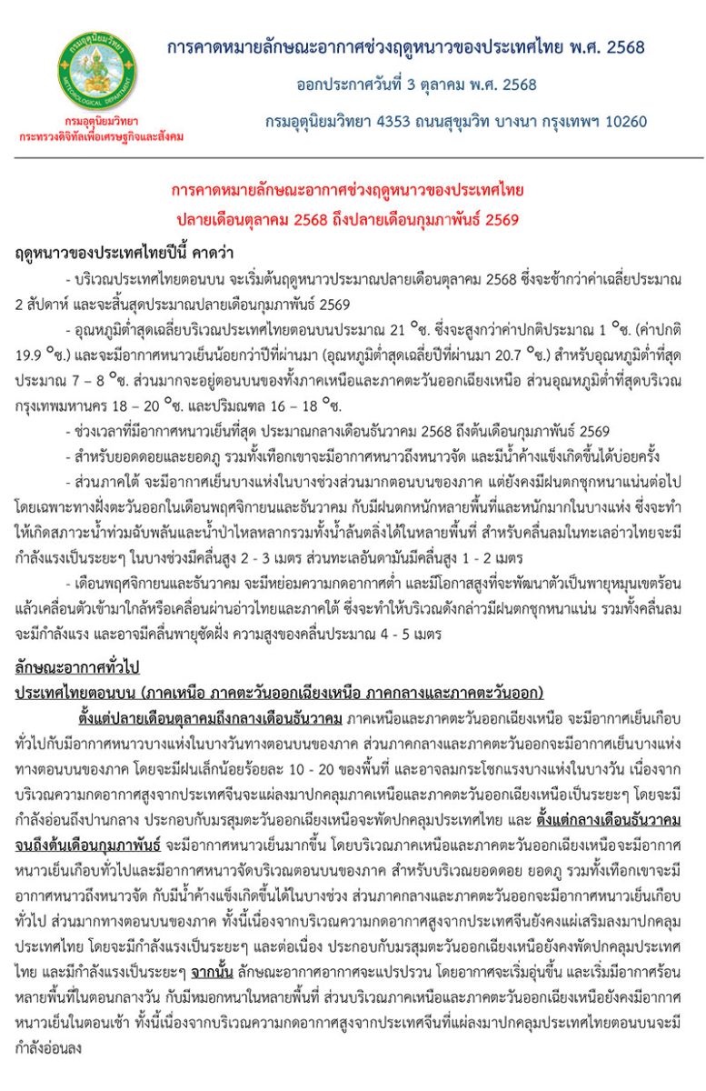 วันที่ 9 ตุลาคม 2568 กรมอุตุนิยมวิทยา ได้เผยแพร่ประกาศการคาดหมายลักษณะอากาศช่วงฤดูหนาวของประเทศไทยปีนี้ ออกประกาศวันที 3 ตุลาคม พ.ศ. 2568 การคาดหมายลักษณะอากาศช่วงฤดูหนาวของประเทศไทย ปลายเดือนตุลาคม 2568 ถึงปลายเดือนกุมภาพันธ์2569