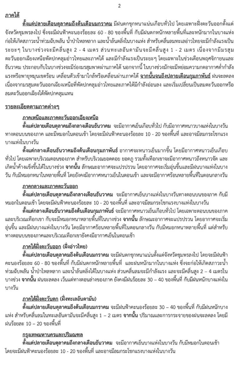 1. เดือนตุลาคม บริเวณภาคกลาง ภาคตะวันออกและภาคใต้ตอนบนจะยังคงมีฝนตกต่อเนื่อง ประกอบกับจะมีน้ำเหนือไหลบ่าลงมา และในบางช่วงจะมีน้ำทะเลหนุนสูง ซึ่งส่งผลให้เกิดน้ำท่วมฉับพลันและน้ำล้นตลิ่งได้ในบางพื้นที่