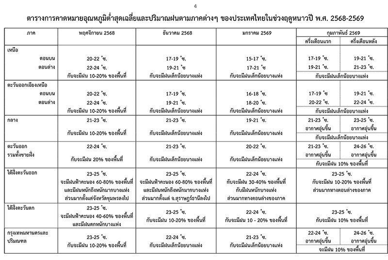 คาดว่า บริเวณประเทศไทยตอนบน จะเริ่มต้นฤดูหนาวประมาณปลายเดือนตุลาคม 2568 ซึ่งจะช้ากว่าค่าเฉลี่ยประมาณ 2 สัปดาห์และจะสิ้นสุดประมาณปลายเดือนกุมภาพันธ์ 2569