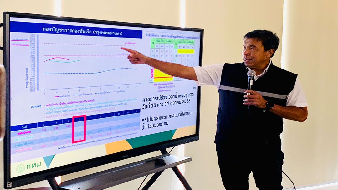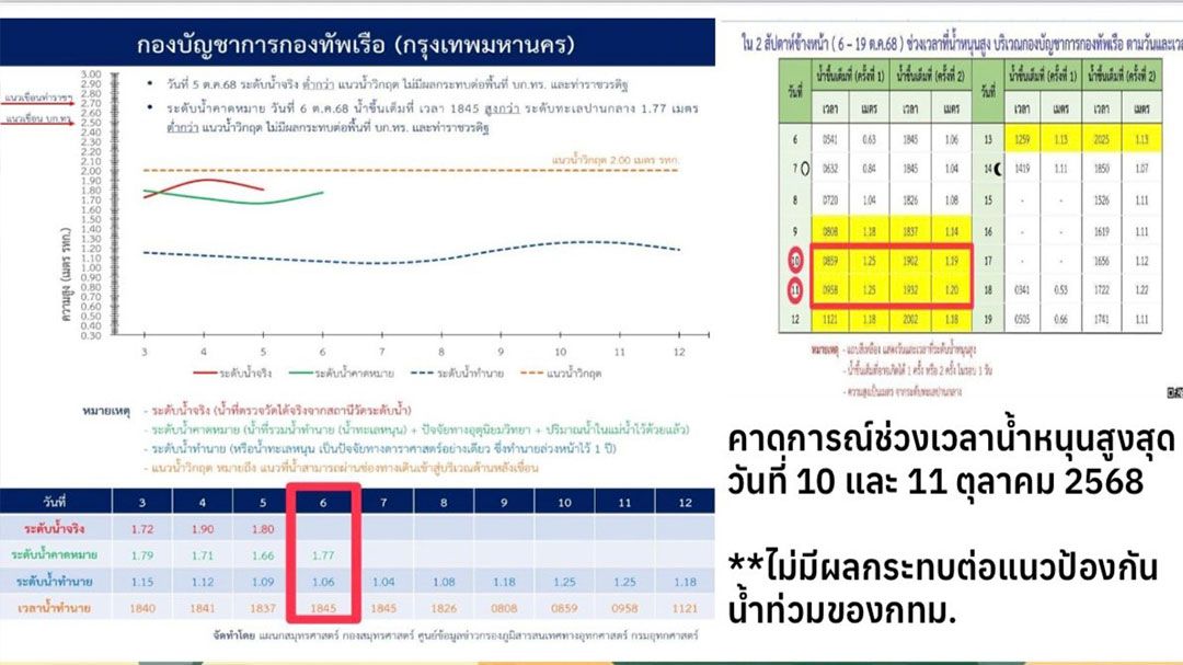 กรุงเทพมหานครแจ้งเตือนประชาชน เฝ้าระวังน้ำทะเลหนุนสูง วันที่ 9 - 18 ตุลาคม 2568 ด้วยอิทธิพลของน้ำทะเลหนุนสูง ประกอบกับมวลน้ำจากตอนบนของลุ่มน้ำไหลลงมาสมทบ รวมทั้งมรสุมตะวันตกเฉียงใต้ และลมตะวันออกพัดปกคลุมทำให้มีฝนตกในบางพื้นที่ ส่งผลให้ระดับแม่น้ำเพิ่มสูงขึ้น (ข้อมูล : กรมอุทกศาสตร์ กองทัพเรือ)