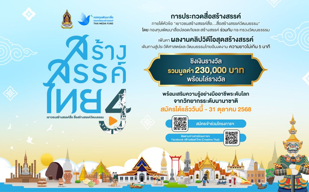 กองทุนพัฒนาสื่อปลอดภัยและสร้างสรรค์ ร่วมกับกระทรวงวัฒนธรรม สานต่อความสำเร็จ เดินหน้าโครงการ “สร้างสรรค์ไทย 4” ภายใต้หัวข้อ “เยาวชนสร้างสรรค์สื่อ...สื่อสร้างสรรค์วัฒนธรรม” ชวนเยาวชนอายุไม่เกิน 25 ปี ร่วมประกวดคลิปวิดีโอสุดสร้างสรรค์ เพื่อเปิดประตูสู่ประวัติศาสตร์และวัฒนธรรมไทยอันงดงามให้คนทั่วโลกได้รู้จัก ความยาวไม่เกิน 5 นาที พร้อมโอกาสพิเศษเสริมทักษะการผลิตสื่อจากวิทยากรระดับโลกที่มาเติมเต็มความรู้ด้านการผลิตสื่ออย่างมืออาชีพ เฟ้นหาผลงานคลิปวิดีโอสุดสร้างสรรค์ ชิงเงินรางวัลรวม 230,000 บาท พร้อมโล่เกียรติยศจากกองทุนพัฒนาสื่อปลอดภัยและสร้างสรรค์ เปิดรับสมัครตั้งแต่วันนี้ – 31 ตุลาคม นี้