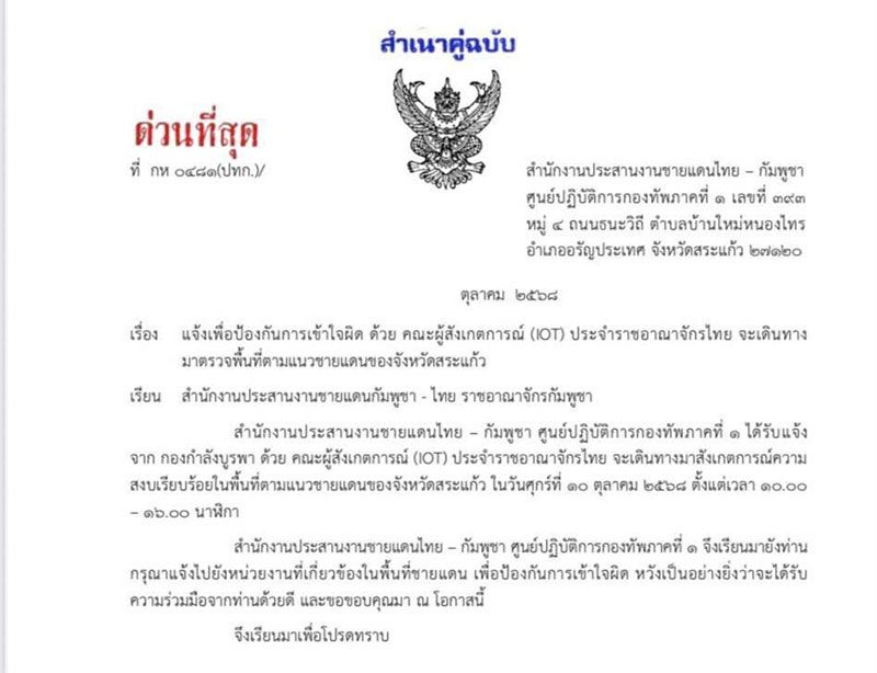 กกล.บูรพา กองทัพภาคที่ 1 ทำหนังสือแจ้งกัมพูชา เตรียมนำ คณะ IOT ฝั่งไทย ลงพื้นที่ชายแดนสระแก้ว พรุ่งนี้ 10.00 - 16.00 ป้องกันเข้าใจผิด