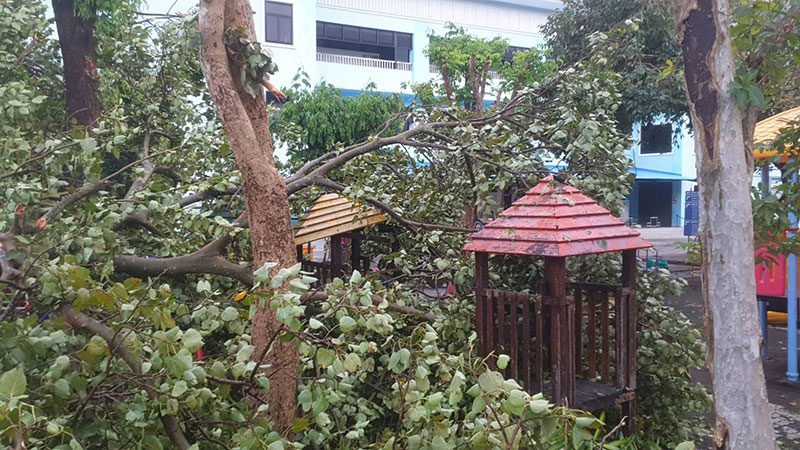 นางเทวัญ คชรินทร์ อายุ 52 ปี ครูพี่เลี้ยงในโรงเรียน เปิดเผยว่า “ช่วงบ่ายมีฝนตกหนักมาก ลมแรงจนได้ยินเสียงต้นไม้หัก ก่อนเห็นต้นโพธิ์ใหญ่ล้มลงมาทับกำแพงและศาลานั่งเล่น ดีที่ไม่มีเด็กอยู่ตรงนั้น ไม่งั้นคงเกิดเหตุร้าย”