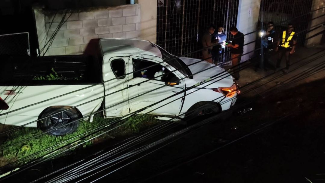 ที่เกิดเหตุอยู่ริมถนนหน้าอู่ซ่อมรถแห่งหนึ่งต่ำกว่าระดับถนนพบรถกระบะสีขาวรุ่นไฮลักซ์ สีขาว ทะเบียน 3 ฒศ5929 กรุงเทพมหานคร สภาพกันชนหน้ารถแตก มีรอยชนจนยุบด้านซ้ายฝั่งประตูคนขับ ภายในรถมีผู้โดยสารเป็นหญิงรวมคนขับทั้งหมด 3 คน เบื้องต้นได้รับบาดเจ็บเล็กน้อย ทราบชื่อคนขับต่อมา น.ส.ณัฐชยา (สงวนนามสกุล) อายุ 22 ปี เป็นคนขับ ห่างไปเล็กน้อยพบเสาไฟฟ้าได้รับความเสียหายหักครึ่งท่อนทำให้ดึงเสาไฟล้มลงกีดขวางทางจราจร เสียหายรวมทั้งหมด 9 ต้น นอกจากนี้มีหม้อแปลงไฟฟ้า รถยนต์ยี่ห้อมิตซูบิชิ รุ่นปาเจโร่ สีขาว ทะเบียน ขฉ 9595 สงขลา ที่จอดหน้าบ้านได้รับความเสียหายถูกเสาไฟล้มใส่หน้ารถและรถเก๋งยี่ห้อโตโยต้า รุ่นวีออส สีขาว ทะเบียน กบ 3238 ตรัง ที่ขับมาตามเส้นทางได้รับความเสียหายเล็กน้อย
