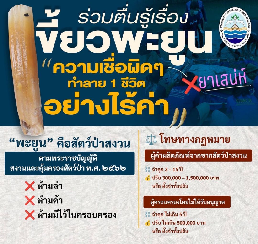 ด้าน ดร.ปิ่นสักก์ สุรัสวดี อธิบดีกรมทรัพยากรทางทะเลและชายฝั่ง เปิดเผยเพิ่มเติมว่า กรมฯ ได้หารือร่วมกับกองบังคับการปราบปรามการกระทำผิดเกี่ยวกับทรัพยากรธรรมชาติและสิ่งแวดล้อม (บก.ปทส.) เพื่อวางแผนป้องกันและปราบปรามการตัดเขี้ยวพะยูน โดยเน้นมาตรการเชิงรุกแบบบูรณาการ ครอบคลุมภาครัฐ เอกชน และชุมชน ผ่านแนวทางหลัก 5 ประการ ได้แก่ 1)การเฝ้าระวังและป้องกัน จัดตั้งทีมลาดตระเวนในแหล่งหญ้าทะเล ใช้เทคโนโลยีโดรนและระบบ citizen science (การมีส่วนร่วมของประชาชนในการติดตาม) เพื่อเฝ้าติดตามพะยูน พร้อมพิจารณาประกาศเขตคุ้มครองใหม่ 2)การช่วยเหลือฉุกเฉิน โดยตั้งทีมกู้ชีพสัตว์ทะเล พร้อมสัตวแพทย์ประจำโรงพยาบาลสัตว์ทะเลหายากในภูเก็ตและตรัง เพื่อให้การรักษาทันท่วงที 3)การป้องกันการล่าและลักลอบ ให้ดำเนินการสืบสวนร่วมกับกรมอุทยานแห่งชาติ สัตว์ป่า และพันธุ์พืช รวมถึงตำรวจท้องที่ โดยบังคับใช้พระราชบัญญัติสงวนและคุ้มครองสัตว์ป่า พ.ศ. 2562 ซึ่งมีโทษสูงสุดจำคุก 15 ปี หรือปรับ 1.5 ล้านบาท