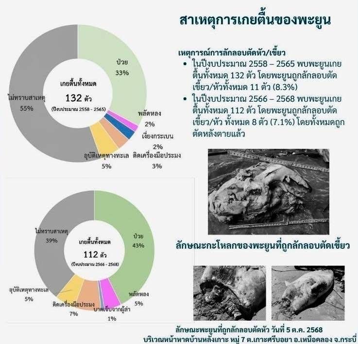 วันที่ 11 ตุลาคม 2568 สถานการณ์พะยูนในประเทศไทยเข้าขั้นวิกฤต หลังจำนวนประชากรลดฮวบจาก 280 ตัวเหลือเพียง 203 ตัวในช่วง 3 ปี ท่ามกลางภัยคุกคามจากการลักลอบตัดเขี้ยวและหัวเพื่อความเชื่อผิดๆนั้น นายสุชาติ ชมกลิ่น รองนายกรัฐมนตรีและรัฐมนตรีว่าการกระทรวงทรัพยากรธรรมชาติและสิ่งแวดล้อม ได้สั่งการด่วนให้หน่วยงานเกี่ยวข้องสืบสวนหาผู้กระทำผิด พร้อมประกาศมาตรการเชิงรุกบูรณาการ เพื่อเปลี่ยนจาก "นับศพ" เป็น "รักษาชีวิต" พะยูน ซึ่งไม่เพียงเป็นสัตว์ทะเลหายาก แต่ยังเป็นตัวชี้วัดสุขภาพระบบนิเวศชายฝั่งไทย ในขณะที่มีรายงานล่าสุด เมื่อวันที่ 5 ตุลาคม 2568 ว่าเจ้าหน้าที่พบศพพะยูนถูกตัดหัวบริเวณหน้าหาดบ้านหลังเกาะ หมู่ 7 ตำบลเกาะศรีบอยา อำเภอเหนือคลอง จังหวัดกระบี่ ซึ่งเป็นเหตุการณ์ที่สะท้อนปัญหาการลักลอบล่าอย่างชัดเจน