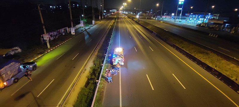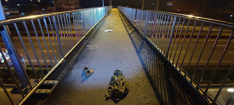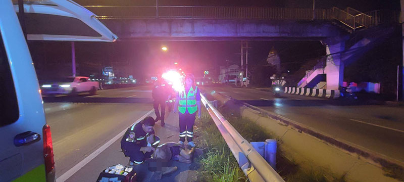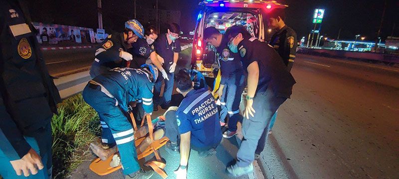ที่เกิดเหตุพบผู้ได้รับบาดเจ็บเป็นชาย 1 ราย อายุประมาณ 55-60 ปี ตรวจสอบตามร่างกายไม่พบเอกสารทางราชการติดตัว นอนอยู่บนถนนช่องทางด่วนเลนซ้ายไม่สวมเสื้อ สวมกางเกงขาสั้นตัวเดียว พูดจาไม่รู้เรื่องเจ้าหน้าที่มูลนิธิปอเต็กตึ้ง จึงได้ประสานรถกู้ชีพโรงพยาบาลธรรมศาสตร์ เฉลิมพระเกียตริ มารับตัวไปรักษา จากการตรวจสอบบนสะพานลอยพบเสื้อเชิ้ตแขนยาวลายทหารบก 1 ตัว รองเท้าหนังผู้ชาย1 คู่ เสื้อยืดสีขาว1ตัว รองเท้าผู้หญิง 1 คู่ ทางกางขาวยาว1 ตัว