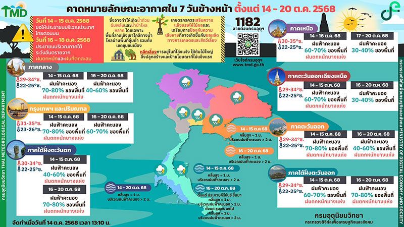 คาดหมายอากาศรายภาควันที่ 14 – 20 ตุลาคม พ.ศ. 2568