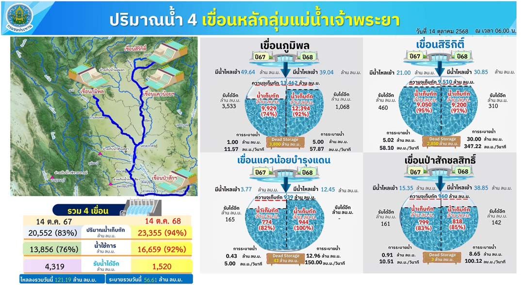 พร้อมกันนี้ให้ปรับเพิ่มการระบายน้ำเขื่อนภูมิพล จ.ตาก จากเดิม 5 ล้าน ลบ.ม./วัน เป็น 10 ล้าน ลบ.ม./วัน เพื่อเสริมการใช้น้ำในการเพาะปลูกพืชด้านท้ายน้ำ