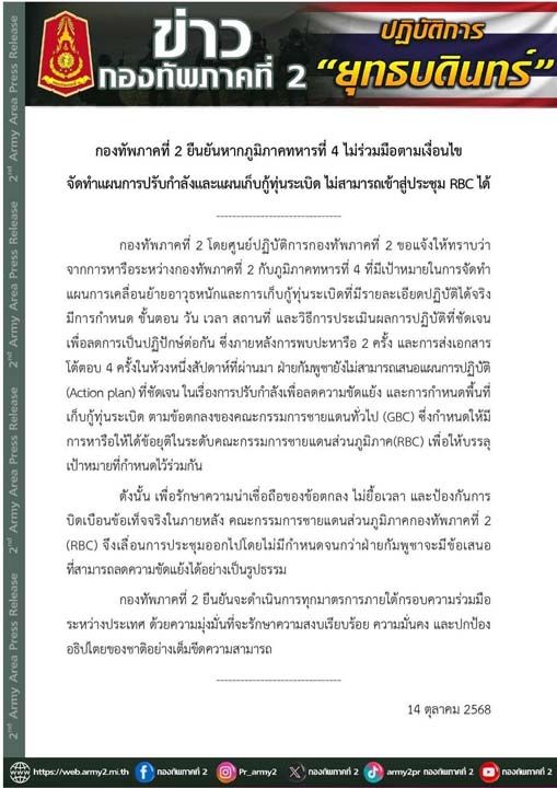15 ตุลาคม 2568 กองทัพภาคที่ 2 (ทภ.2) โดยศูนย์ปฏิบัติการกองทัพภาคที่ 2 ขอแจ้งให้ทราบว่า จากการหารือระหว่างกองทัพภาคที่ 2 กับภูมิภาคทหารที่ 4 ที่มีเป้าหมายในการจัดทำ แผนการเคลื่อนย้ายอาวุธหนัก และการเก็บกู้ทุ่นระเบิดที่มีรายละเอียดปฏิบัติได้จริงมีการกำหนด ขั้นตอน วัน เวลา สถานที่ และวิธีการประเมินผลการปฏิบัติที่ชัดเจน เพื่อลดการเป็นปฏิปักษ์ต่อกัน