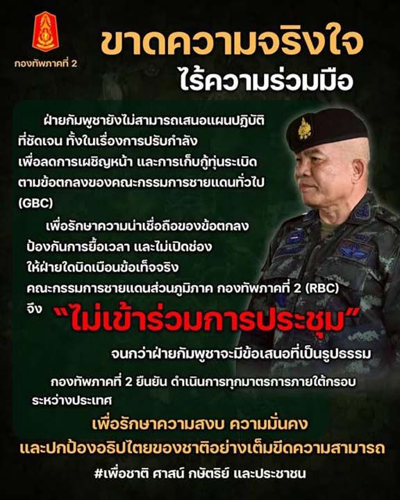 กองทัพภาคที่ 2 ย้ำว่า กัมพูชาขาดความจริงใจ ไร้ความร่วมมือ ฝ่ายกัมพูชายังไม่สามารถเสนอแผนปฏิบัติ ที่ชัดเจน ทั้งในเรื่องการปรับกำลัง เพื่อลดการเผชิญหน้า และการเก็บกู้ทุ่นระเบิดตามข้อตกลงของคณะกรรมการชายแดนทั่วไป (GBC) เพื่อรักษาความน่าเชื่อถือของข้อตกลงป้องกันการยื้อเวลา และไม่เปิดช่องให้ฝ่ายใดบิดเบือนข้อเท็จจริง คณะกรรมการชายแดนส่วนภูมิภาค กองทัพภาคที่ 2 (RBC) จึง “ไม่เข้าร่วมการประชุม” จนกว่าฝ่ายกัมพูชาจะมีข้อเสนอที่เป็นรูปธรรม