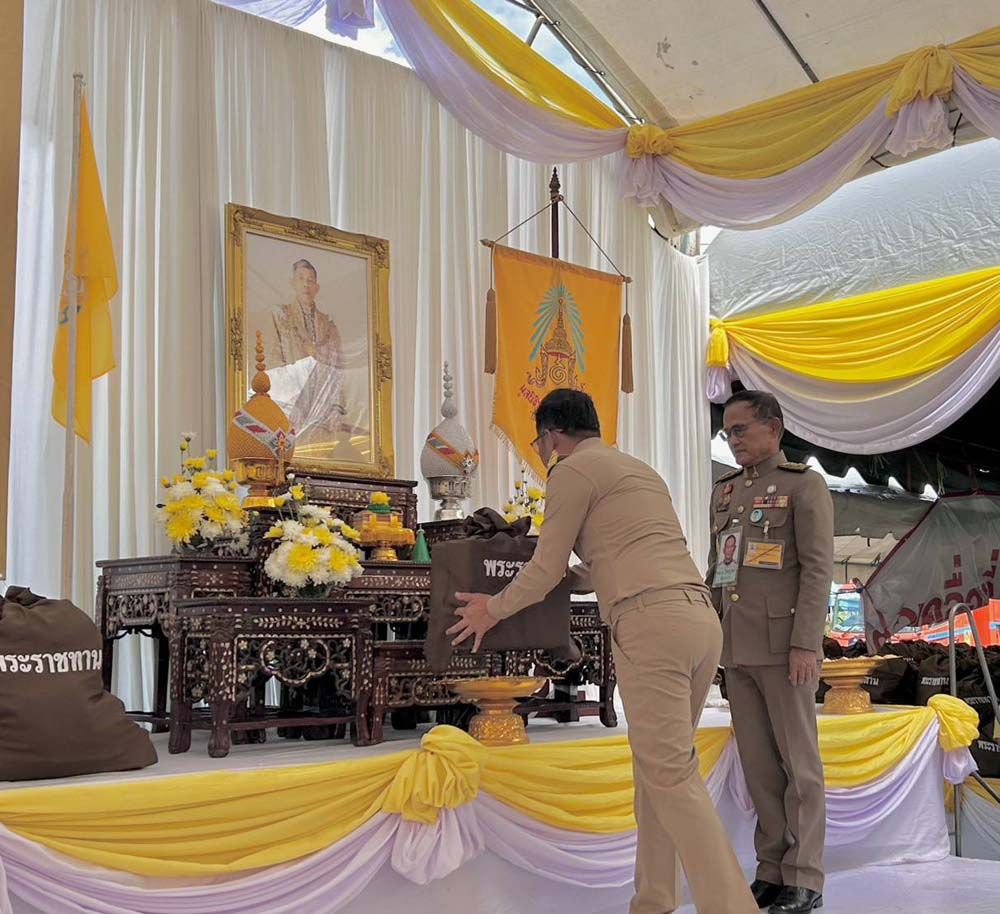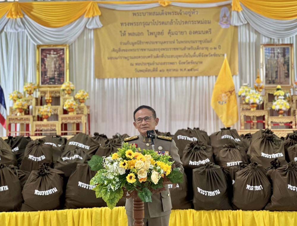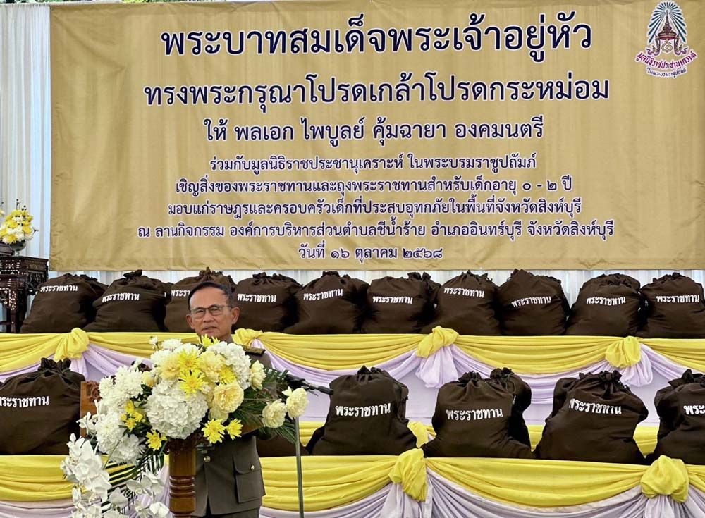 วันที่ 16 ตุลาคม 2568 เวลา 08.56 น. พระบาทสมเด็จพระเจ้าอยู่หัว ทรงพระกรุณาโปรดเกล้าโปรดกระหม่อมให้ พลเอก ไพบูลย์ คุ้มฉายา องคมนตรี ร่วมกับมูลนิธิราชประชานุเคราะห์ ในพระบรมราชูปถัมภ์ เชิญถุงพระราชทานและเครื่องอุปโภคบริโภค จำนวน 1,925 ถุง และเชิญถุงพระราชทานสำหรับเด็ก จำนวน 71 ถุง ซึ่งถุงพระราชทานสำหรับเด็กจะแตกต่างจากถุงพระราชทานทั่วไป โดยบรรจุสิ่งของเครื่องใช้สำหรับเด็กเป็นพิเศษ ประกอบด้วย ตุ๊กตาผ้าห่ม เป้อุ้มเด็ก นมผง อาหารเด็ก ผ้าอ้อมสำเร็จรูป สำลี ฟองน้ำเช็ดตัว ผลิตภัณฑ์ทำความสะอาด และผลิตภัณฑ์ซักล้างสำหรับเด็ก รวมทั้งสิ่งของจำเป็นสำหรับเด็ก ไปมอบแก่ผู้ว่าราชการจังหวัด นายอำเภอ ซึ่งเป็นตัวแทนราษฎร เพื่อเชิญไปมอบแก่ราษฎรที่ประสบอุทกภัยในพื้นที่จังหวัดชัยนาทต่อไป และมอบแก่ราษฎรอำเภอสรรพยา ณ หอประชุมที่ว่าการอำเภอสรรพยา จังหวัดชัยนาท เพื่อช่วยบรรเทาความเดือดร้อนในเบื้องต้นและเป็นขวัญกำลังใจ
