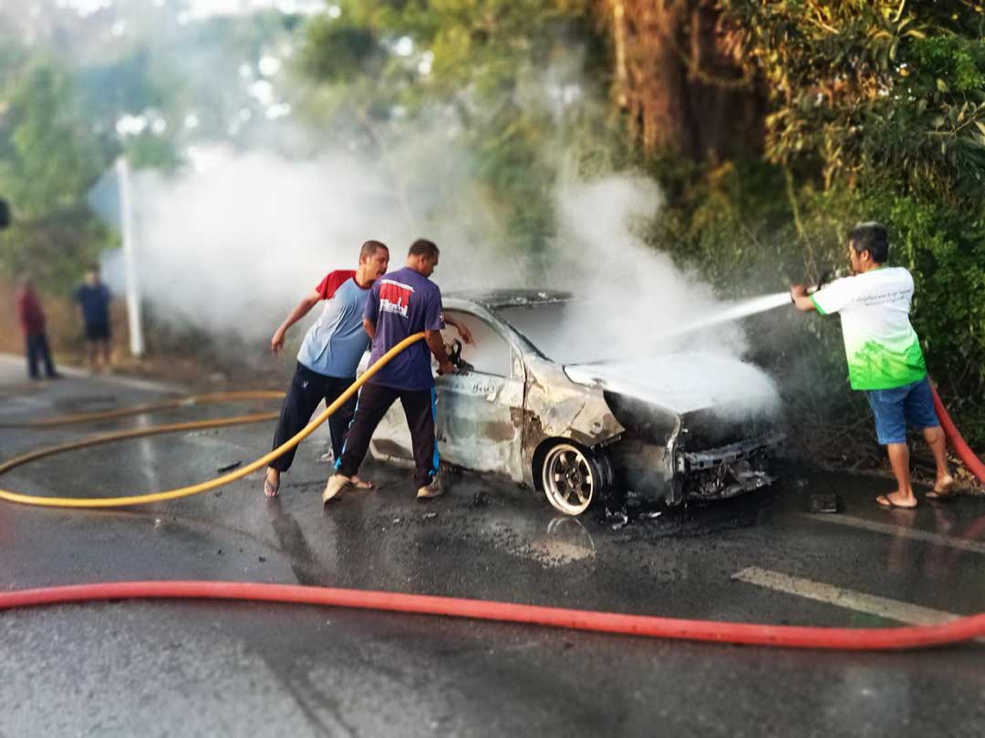 หวิดถูกย่างสด! ‘เก๋งไฟโหมกระหน่ำ’ กลางถนนวิเชียรบุรี คนขับหนีออกมาได้ทัน คาดสาเหตุจากน้ำมันรั่วไหลใต้ท้องรถ