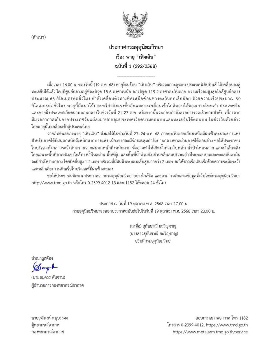 เมื่อเวลา 17.00 น.วันที่ 19 ตุลาคม 2568 กรมอุตุนิยมวิทยา ประกาศเรื่อง พายุ "เฟิงเฉิน" ฉบับที่ 1 (292/2568) ระบุว่า เมื่อเวลา 16.00 น.ของวันนี้ (19 ต.ค.68) พายุโซนร้อน "เฟิงเฉิน" บริเวณเกาะลูซอน ประเทศฟิลิปปินส์ ได้เคลื่อนลงสู่ทะเลจีนใต้แล้ว โดยมีศูนย์กลางอยู่ที่ละติจูด 15.6 องศาเหนือ ลองจิจูด 119.2 องศาตะวันออก ความเร็วลมสูงสุดใกล้ศูนย์กลางประมาณ 65 กิโลเมตรต่อชั่วโมง กำลังเคลื่อนตัวทางทิศเหนือค่อนทางตะวันตกเล็กน้อย ด้วยความเร็วประมาณ 30 กิโลเมตรต่อชั่วโมง พายุนี้มีแนวโน้มจะทวีกำลังแรงขึ้นอีกและจะเคลื่อนเข้าใกล้ตอนใต้ของเกาะไหหลำ ประเทศจีน และชายฝั่งประเทศเวียดนามตอนกลางในช่วงวันที่ 21 - 23 ต.ค.หลังจากนั้นจะอ่อนกำลังลงอย่างรวดเร็วตามลำดับ เนื่องจากมีมวลอากาศเย็นจากประเทศจีนแผ่ลงมาปกคลุมประเทศเวียดนามตอนบนและทะเลจีนใต้ตอนบน ในช่วงวันดังกล่าว โดยพายุนี้ไม่เคลื่อนเข้าสู่ประเทศไทย