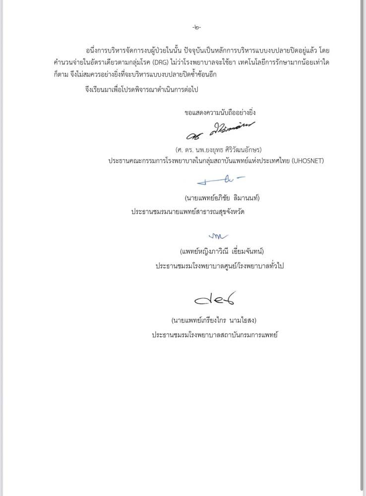 ชมรมนายแพทย์สาธารณสุขจังหวัด ชมรมโรงพยาบาลศูนย์และโรงพยาบาลทั่วไป ชมรมโรงพยาบาลสังกัดกรมการแพทย์ และเครือข่ายสถาบันแพทย์แห่งประเทศไทย (Uhosnet) โดยทั้งหมดได้ร่วมลงนามในจดหมายเปิดผนึกถึงรัฐมนตรี ขอให้ทบทวนการบริหารงบผู้ป่วยในของ สปสช.