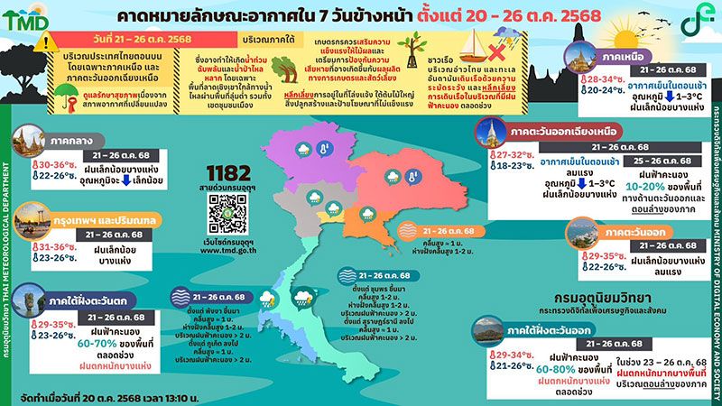 วันที่ 20 ตุลาคม 2568 กรมอุตุนิยมวิทยา คาดหมายลักษณะอากาศใน 7 วันข้างหน้า ระหว่างวันที่ 20 ตุลาคม-26 ตุลาคม พ.ศ. 2568