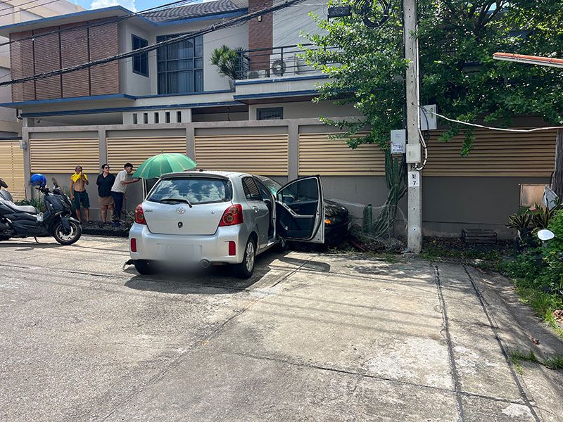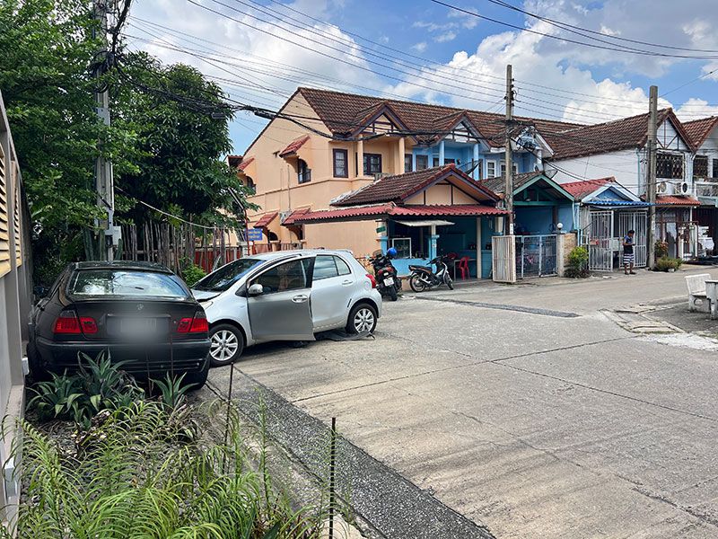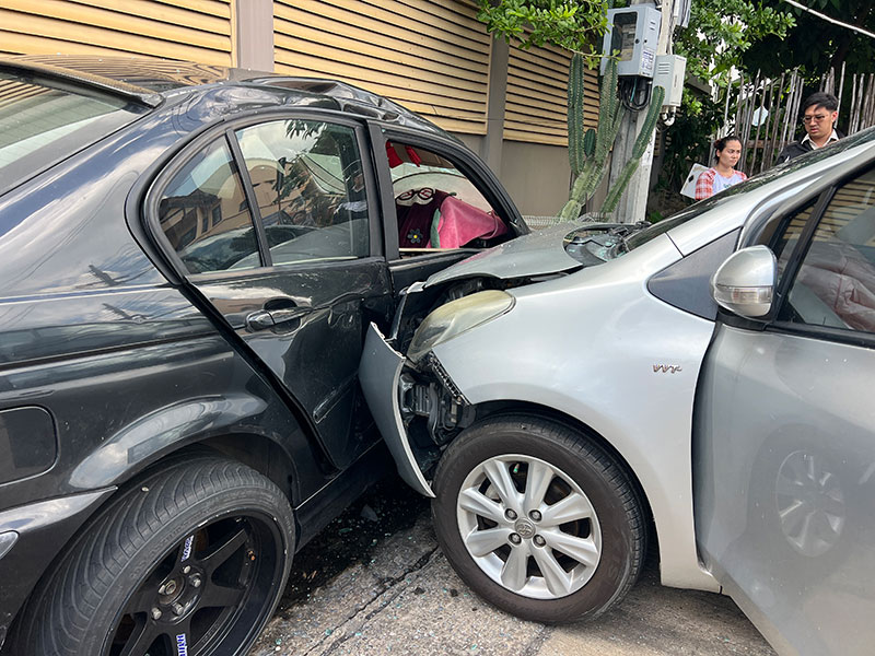 ที่เกิดเหตุพบรถเก๋งยี่ห้อ โตโยต้า รุ่นยาริส สีบรอนซ์-เงิน ทะเบียนนนทบุรี อยู่ในลักษณะพุ่งชนอัดติดกับรถเก๋งยี่ห้อ BMW สีดำ ทะเบียน กทม. สภาพรถทั้ง 2 คันพังเสียหายยับเยิน ส่วนผู้ขับขี่รถเก๋งโตโยต้า คือนายประมุข อายุ 59 ปี มีอาการบาดเจ็บที่หน้าอกและซี่โครง กู้ภัยปฐมพยาบาลเบื้องต้นก่อนนำตัวส่งโรงพยาบาลกรมชลประทานปากเกร็ด ขณะเดียวกันกล้องวงจรปิดสามารถบันทึกภาพไว้ได้อย่างชัดเจนในขณะที่รถเก๋งยี่ห้อ โตโยต้า มาด้วยความเร็วก่อนพุ่งชนรถเก๋ง BMW ที่จอดอยู่ริมทางอย่างแรง